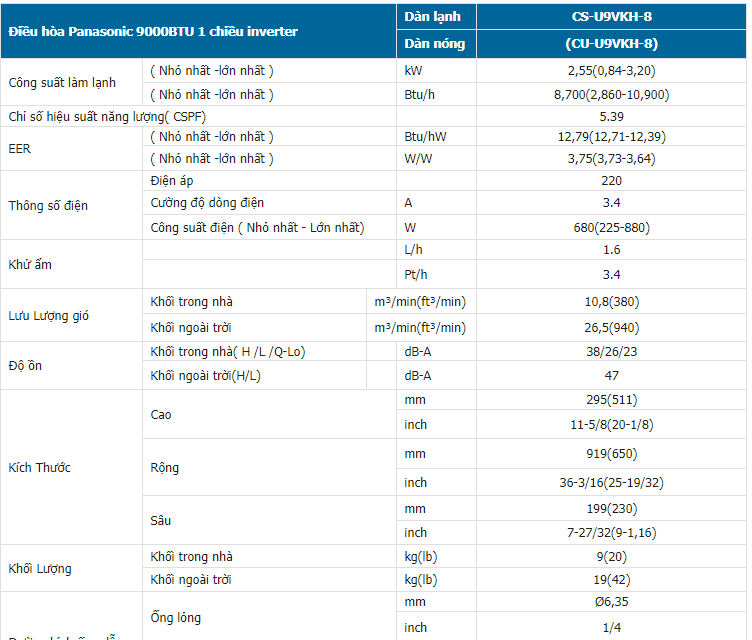 Thông số kỹ thuật điều hòa Panasonic 1 chiều Inverter 9.000BTU U9VKH-8